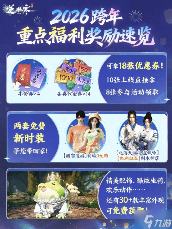 不得不说,“国家队”炸鱼就是猛,也足以见得逆水寒本次跨年版本成本之昂贵。此外,作为跨年重磅版本,官方还放出了相当豪横的福利,包括18张代金券、2款免费时装、全新坐骑等等。