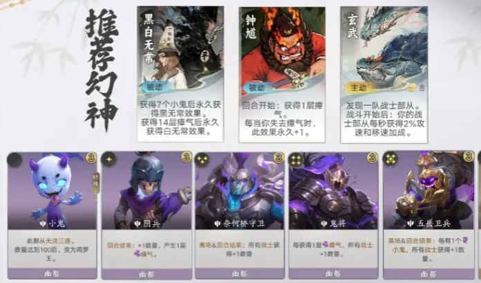 阵容构建逻辑清晰:前期以阴兵为核心过渡单位,每回合结束自动触发鬼将技能,稳定提供战士数量增益。五岳卫兵、奈何桥守卫与玄武三者构成关键协同链——前者强化召唤效率,中者提升基础兵力上限,后者赋予全体战士攻速与移速加成。小鬼既是作战单元,亦是经济来源,出售可获取金币,积攒至阈值后即刻进阶为终极单位阎罗。幻神位推荐黑白无常,其技能可大幅提升小鬼生成速率,解锁后全队战力实现质变跃升。