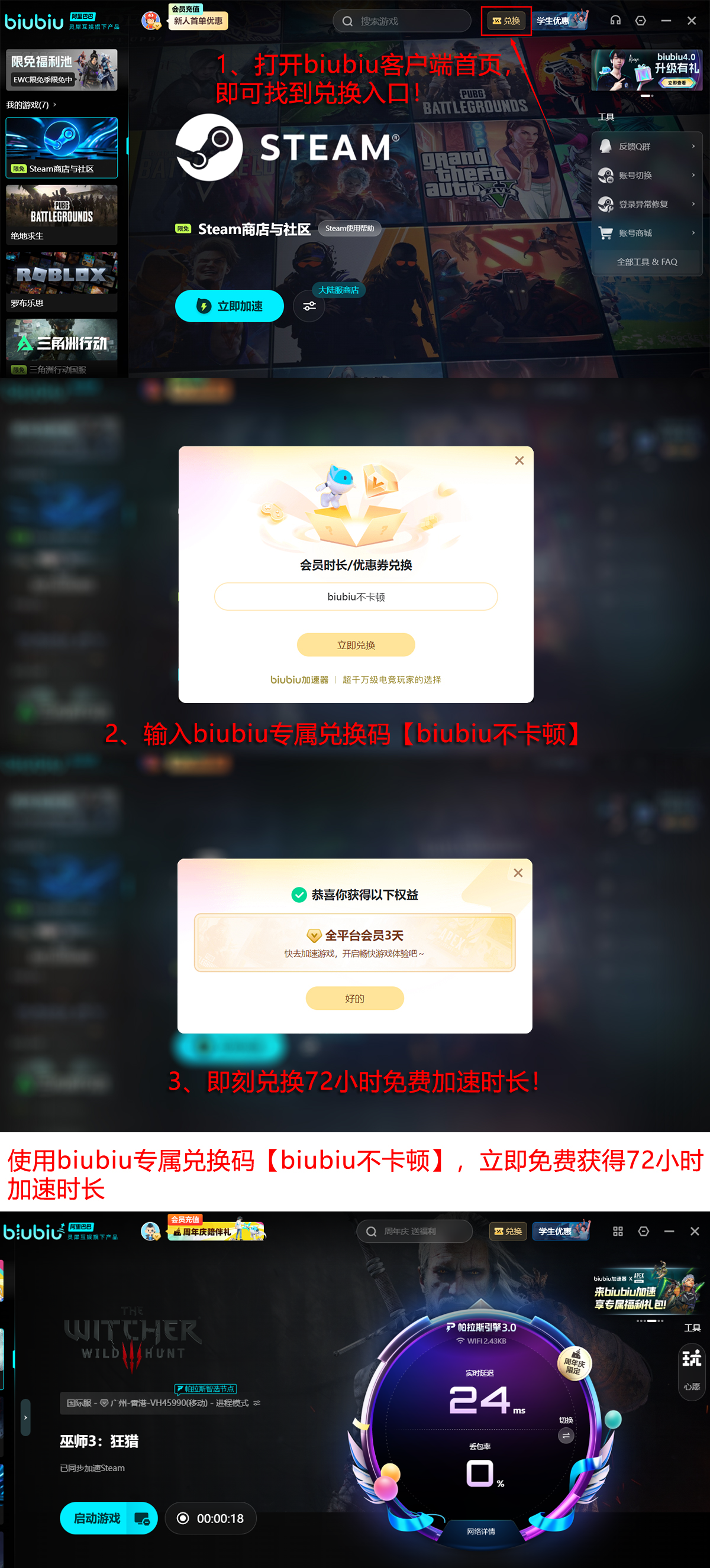 新用户注册后可立即领取24小时全节点免费加速权限。此外,输入通用兑换码【biubiu不卡顿】,无论新老账户均可额外激活3日连续加速服务。综合计算,首次使用用户最高可享累计96小时无中断网络优化支持,覆盖主线全流程推进所需时长。