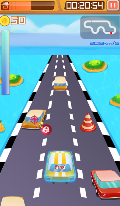 主打轻松向休闲体验,摒弃写实主义路线,采用明快饱和的卡通渲染技术。赛车造型圆润灵动,赛道中穿插各类趣味障碍与移动载具,要求玩家保持高频微操避让。金币收集为重要成长路径,单位时间内拾取数量决定最终奖励档位,适合碎片化时间快速上手与反复挑战。