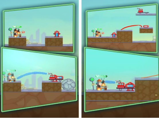 采用轻量化卡通美术风格,但内核基于刚体物理引擎设计。玩家需操控消防车穿越狭窄巷道、斜坡桥梁与坍塌区域,通过精准控制水泵压力、水柱角度与喷射时长扑灭不同燃烧物(木材、油料、电器)。关卡设置动态风向、可燃物蔓延速率及结构承重衰减等变量,考验操作稳定性与环境预判力。