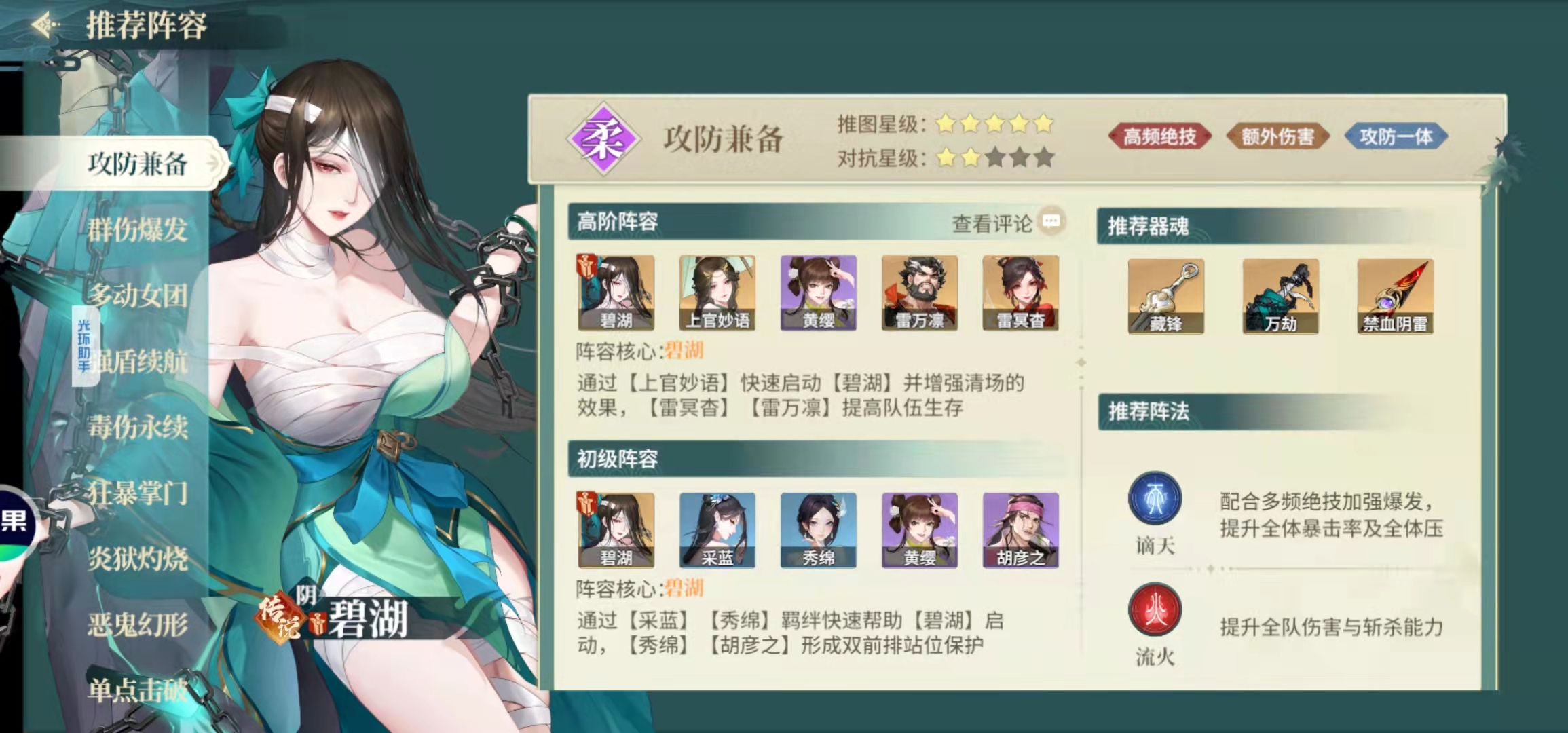 现在新区碧湖可以完美过渡前期,搭配好获取的上官、雷万凛、黄缨等侠客,能够很好解决推图、爬塔、打本等任务(截图里基本阵容都能用。或者直接火毒起手强无敌。