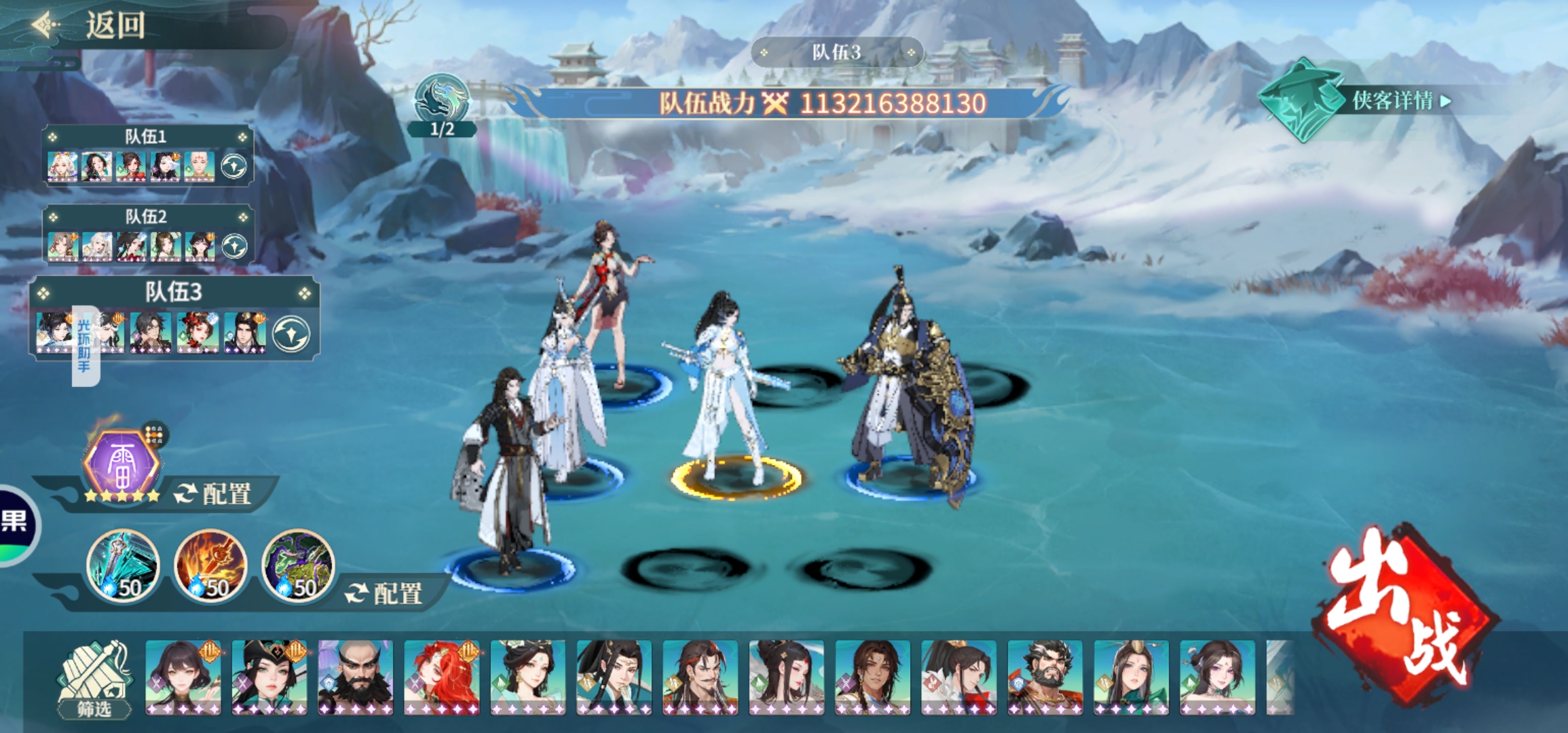 现在的版本侠客百花齐放,侠客也不仅是单C,还有主副C,所以大家不必追求所谓最强阵容,只需要结合自己的资源合理培养,并且在PVP中选好阵形、阵法和站位来对阵不同的阵容,就基本做到越战或防越战(前提是器魂、心法差不多)。最后附上我33的阵容,我有火队配置但还是挂着鱼肚。
