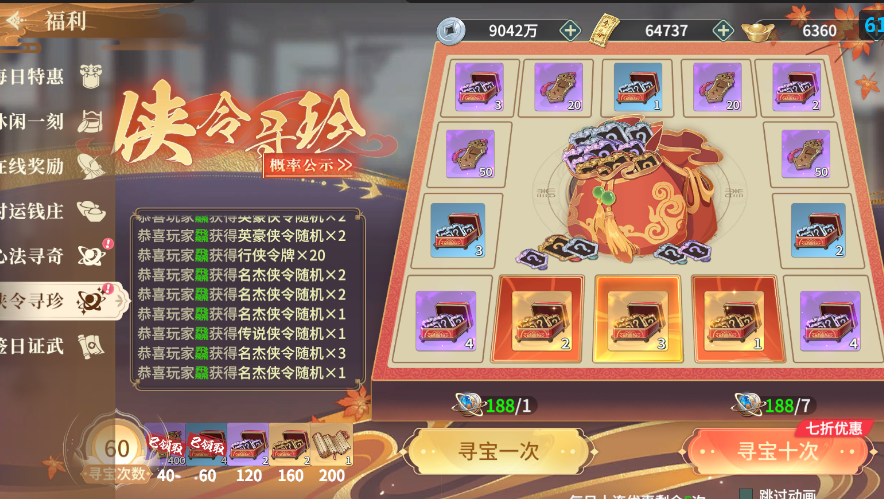 侠令夺宝建议等有排名活动时候再抽,只抽七折的。氪金大佬也留一些冲排名比较合适。