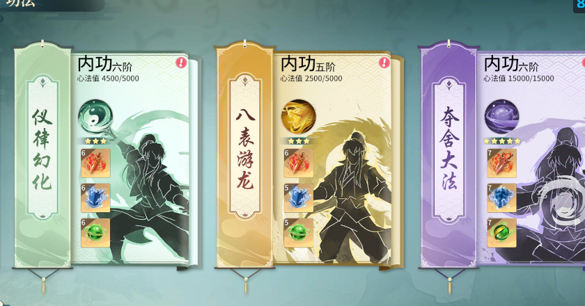 内功修炼这个板块,优先点攻击和生命就行,四个内功平均升级就好,加的属性是全体的,和器魂是同理的,上文提到的技能等级只和安装的心法等级有关。