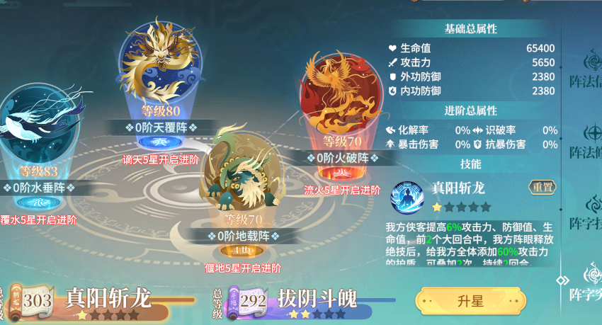 阵法修炼需要的兵书和点阵图在不觉云上楼获取,长期养成的东西不要急。阵字突破后面会开,平均提升等级就行,真阳斩龙和拔阴斗魂这两个技能都升到2星之后优先升后者。