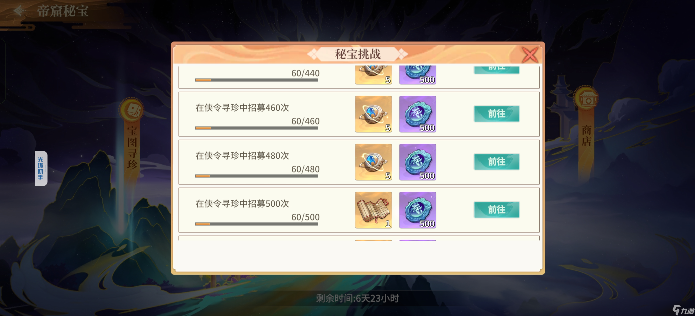 主要获取随机侠令的活动。抽取侠令达到一定次数送名侠谱,这东西还是不错的,能在活动拿到尽量在活动拿,也就是每期帝窟尽可能抽500次,所以建议大家等到活动时候每天抽50次侠令,其他时候都存起来,没有帝窟活动不要抽侠令,能多拿一些资源。