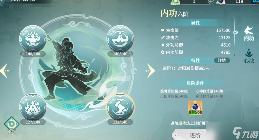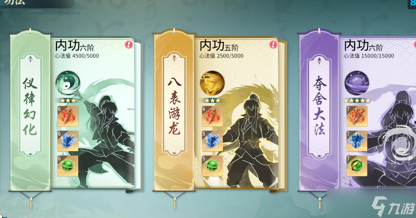 内功修炼这个板块,优先点攻击和生命就行,四个内功平均升级就好,加的属性是全体的,和器魂是同理的,上文提到的技能等级只和安装的心法等级有关。
