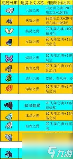 12.泰拉瑞亚之翼:通过20个光明碎片、20个灵魂之火、20个深渊鱼鳍和10个灵魂灰烬合成而成,拥有传说级的悬浮能力和+7%飞行速度加成。