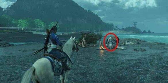 首先需要前往地图上【及部川】南边海岸线,即河流入海口处。在此处海岸边可看到一名独自站在小营地旁的浪人,与他交谈。