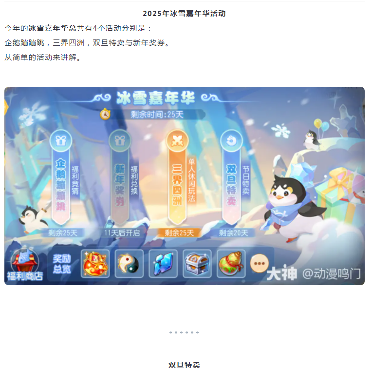 本期分享为大家带来冰雪嘉年华活动攻略合集。今年的冰雪嘉年华总共有4个活动分别是:企鹅蹦蹦跳,三界四洲,双旦特卖与新年奖券。从简单的活动来讲解。
