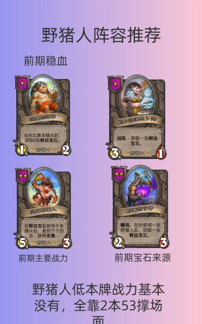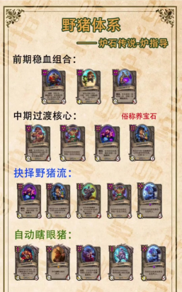 游戏前期,优先找野猪人相关卡牌。比如1费的淡水鳄,2费的刺背野猪人等,尽量凑齐低费野猪人体系,保证前期场面的稳定。同时,留意有没有展览馆法师等能增强随从的卡牌,拿到手后可以先给前期的野猪人提升属性,以便更好地过渡到中期。