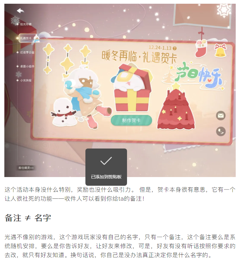 在宴会日期间,国服还有一个小活动,叫礼遇贺卡,顾名思义,就是给好友发贺卡,一天可以发10张, ?赠送贺卡,收到贺卡,还有前往活动场景圆梦村,分别都能完成一个小任务,领取一个魔法。