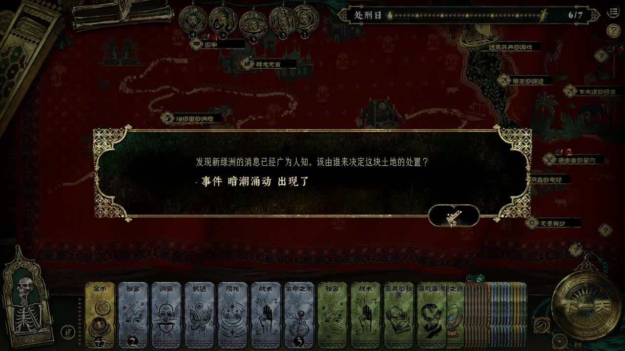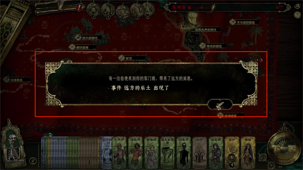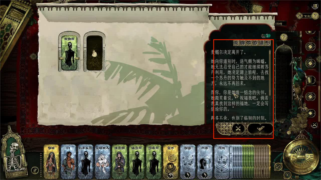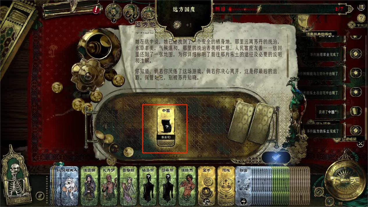 完成上面两个任务之后主角只需要等待,并且在等待的时间活下来努力不被苏丹杀害,直到一名信使来到家门口,触发任务【远方的乐土】,信使要求我们交给他一枚金币,随后就可以获得金色品质的逃亡的目的地【中国】。