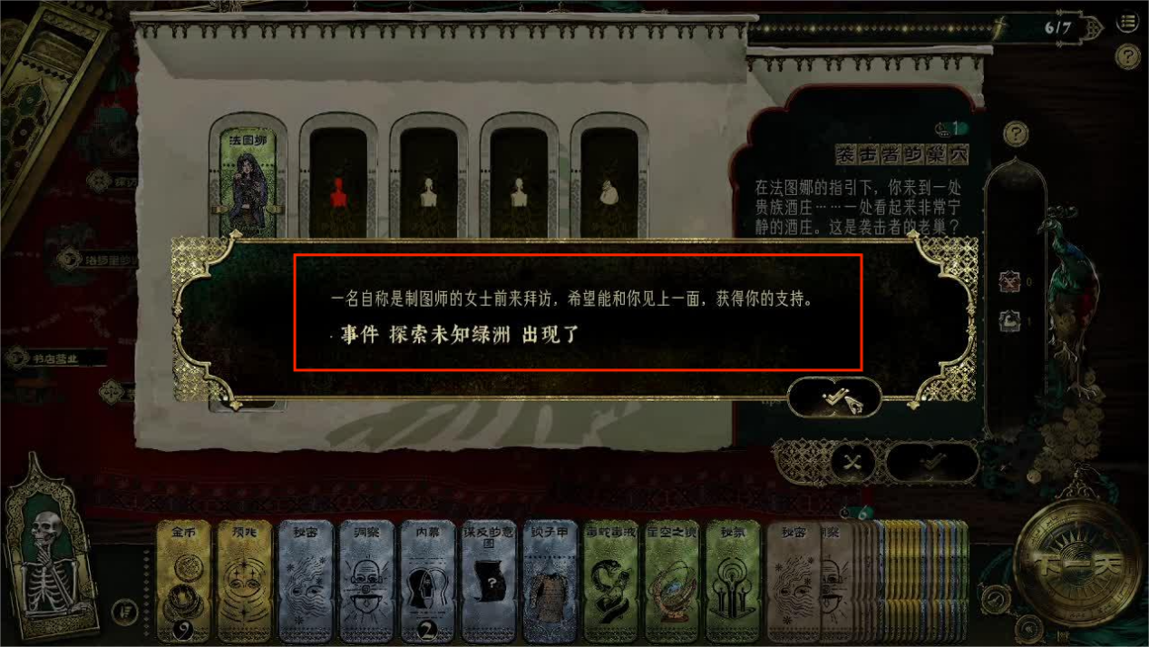 游戏的前期主角会在任意回合触发任务【探索未知绿洲】,一个自称是制图师的探险家npc找上主角,请求主角的资助。