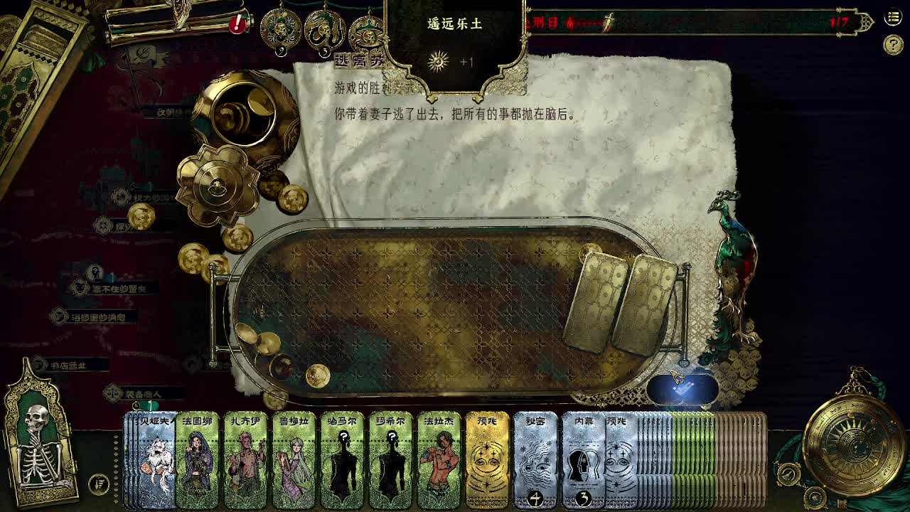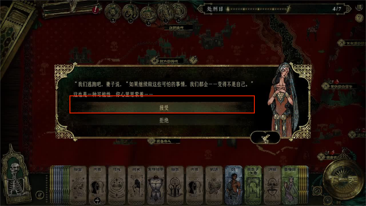 首先在游戏的一开始,我们不能有“妻子的不满”这一张卡,如果有需要尽快折掉以免影响喏任务的触发,随后在游戏的前期会在随机回合触发妻子想要和主角一起逃离的想法。