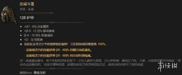《暗黑破坏神4》中,忠诚斗篷的获得方式是击败格里戈利boss。这件装备不仅提供高额护甲和全属性加成,还能提升移动速度和伤害减免。更独特的是,当相匹配的灵体选择时,其效果翻倍,包括精力消耗减免和冷却时间缩减。