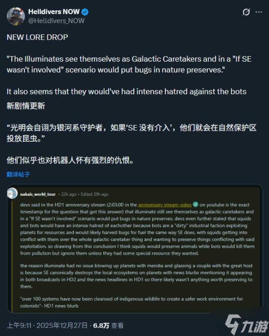 这一描述似乎打破了我们之前的固有认知:毕竟在游戏中只表现了绝地潜兵们同光能族,机器人和终结族虫子们的战斗,并没有提及过三个敌人之间太多的关系,而揭露了三方阵营关系并不和睦的这段新剧情或许将作为一个伏笔,引出一段可能发生的新事件:光能族和其他阵营的大战。