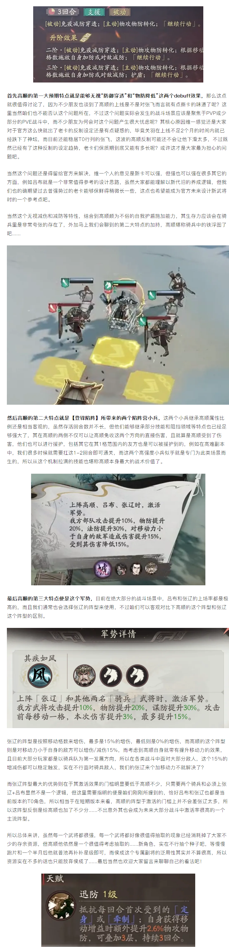 全新的限定武将高顺上线,那么通过目前官方所放出的信息来看,高顺这位角色......还是非常有特点的,咱们先不考虑如资源储备等其它因素,就奔着客观讲这个新角色的抽取价值,其实我们也很容易得出一个显而易见的结论,其便是高顺还是一个非常有潜力的新武将,目前维一个人认为......他的强度下限可能都不值T1这么简单了,所以今天的攻略咱们就来简单聊聊高顺的三大预期特点。