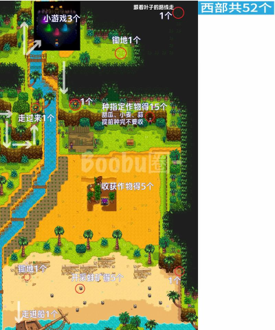 姜岛西部区域是金核桃分布最密集的地方,共有52个金核桃。进入西部区域前,你需要花费10个金核桃让挡路的乌龟离开。进入后可以在多处使用锄头挖掘获得金核桃,比如楼梯上方的土地。西部区域的农场周围也有很多隐藏的金核桃,可以通过砍树、挖掘地面或者完成特定任务来获取。这个区域的金核桃数量最多,建议优先探索。