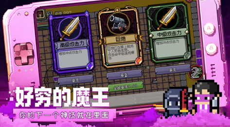 像素风格资源管理+轻度战斗RPG。玩家扮演初始资源匮乏的魔王,通过伐木、采矿积累基础材料,逐步建设炼金工坊、兵营等设施,生产装备与部队。战斗强调走位闪避与攻击节奏配合,虽无复杂数值体系,但“割草”式清怪体验流畅,成长反馈直观。