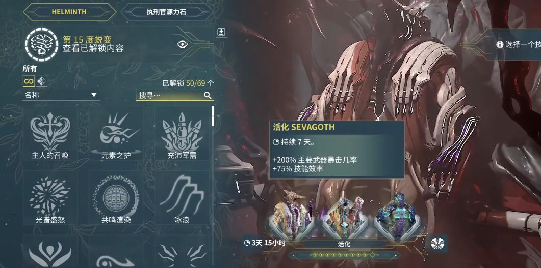 寄生者具备有镶嵌源力石、移植技能与战甲活化等能力,在火卫二处达到八段声望,便能兑换巢体活化模块设计图并进行制作。解锁后每周寄生者都能提供三个随机的战甲与随机的活化属性,可以消耗一定的寄生者分泌物,来活化对应的战甲并获得加成。与战甲移植技能不同的是,该活化增益状态只有七天的时限,当我们的活化次数超过十次后,便会出现覆盖战甲的进阶选项。