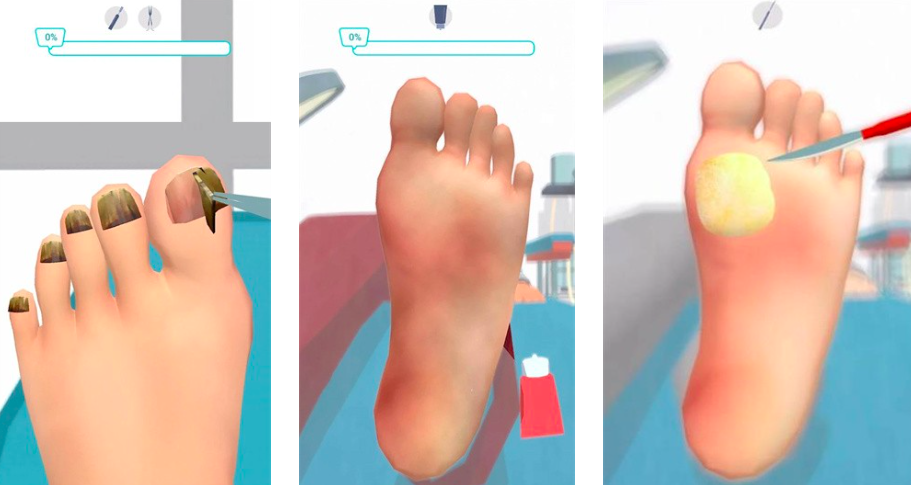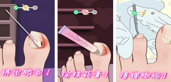 侧重经营模拟与技能进阶机制。每日随机接待多位顾客,足部问题组合多样(如灰指甲合并脚气、趾甲内生伴炎症等),要求玩家综合判断优先级。八类器械各具功能边界:修甲剪用于剪切、锉刀负责塑形、刮匙专攻深层角质。完成服务后按准确度、耗时、顾客满意度结算金币,用于升级工具库或解锁高级护理项目。