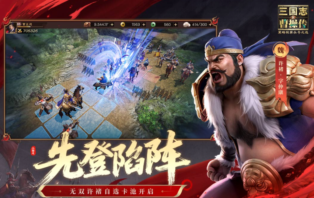 聚焦曹魏阵营视角的高拟真战棋作品,采用写实美术风格与精准历史考据相结合的设计思路。武将立绘保留东汉末年甲胄形制特征,技能体系严格对应史料记载的统兵特点(如张辽“威震逍遥津”强化骑兵突击、郭嘉“十胜十败”提供战前增益)。棋盘为标准8×8方格布局,支持高低差地形判定与视野遮蔽机制,战斗动画还原冷兵器交锋细节。卡池系统仅用于解锁隐藏剧情与特殊兵种,不影响基础战力成长路径。