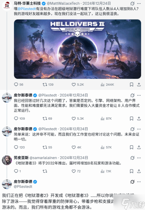 首席创意官兼创意总监 Johan Pilestedt曾在去年的粉丝互动中表示“我们正在把《绝地潜兵2》开发成《绝地潜兵3》……”