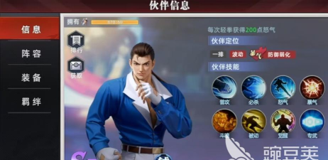 罗伯特在实战中的定位是辅助型的输出角色,它的爆气效果是带来防御弱化状态。普攻拥有轻拳和重拳这两个效果,重拳可以在每次行动前生成最多两次,造成额外的物理伤害。必杀技霸王翔吼拳,攻击单体目标造成物理伤害后,有几率造成波动效果,使对方在回合结束时受到额外伤害,此伤害无视防御波动,能持续三个回合。在爆气状态下,额外提高自身10%的暴击,持续两回合。
