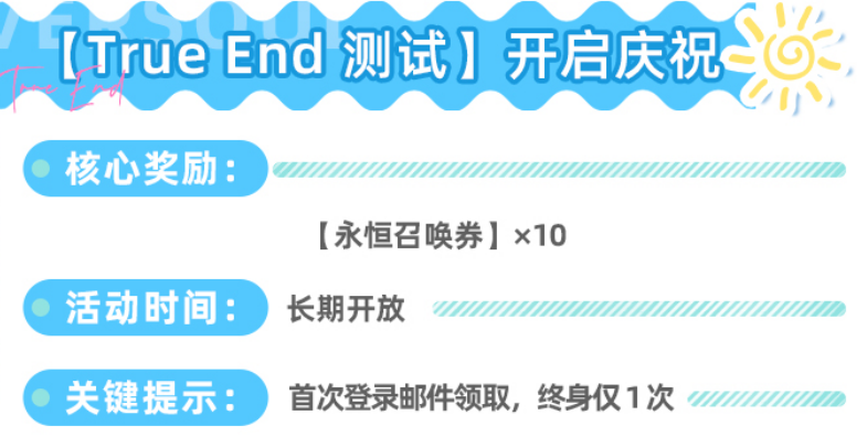 “True End测试开启庆祝”为一次性登录奖励活动。玩家首次进入游戏后,系统将通过邮件发放10张永恒召唤券。每位账号仅限领取一次,无时间窗口限制,但需确保首次登录时网络畅通以接收邮件。