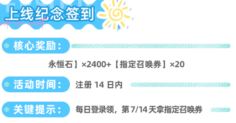 “上线纪念签到”周期为14天,每日登录即可领取对应资源。完整签到共可获得2400永恒石与20张指定召唤券,其中第7日与第14日额外发放指定召唤券。活动有效期为注册后14天,操作简单,只需每日点击确认即可。
