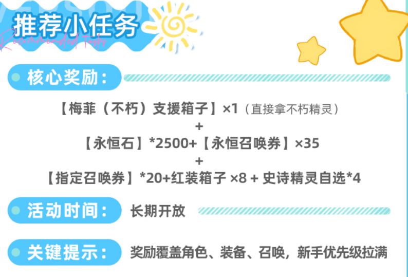 “推荐小任务”是新手阶段性价比最高的常驻活动。全部完成可获得梅菲不朽支援箱子(内含不朽级精灵)、2500永恒石、35张永恒召唤券、20张指定召唤券、8个红色品质装备箱,以及4次史诗精灵自选机会。该活动覆盖角色养成、装备强化与抽卡资源三大核心维度,无时间限制,入口位于游戏主界面右侧,建议优先推进。