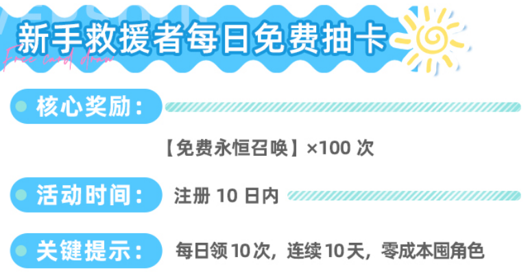 “新手救援者每日免费抽卡”为注册后10天专属活动,每日可领取10次永恒召唤机会,总计100次。该资源不可累积、不可补领,过期自动失效。虽单日次数固定,但百次召唤量足以显著扩充角色池,加速阵容成型速度。