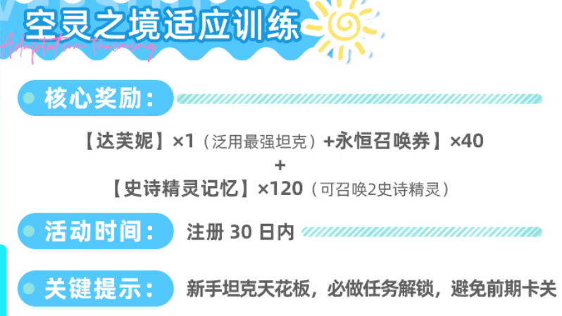 “空灵之境适应训练”为注册后30天内有效,通关后直接赠送坦克位角色达芙妮,兼具高生存与团队承伤能力,是前期推图不可或缺的前排主力。此外还可获取40张永恒召唤券及120个史诗精灵记忆碎片——恰好合成2名史诗级精灵。活动入口设于主界面右上角轮播栏,建议在遭遇关卡卡点前尽早完成。