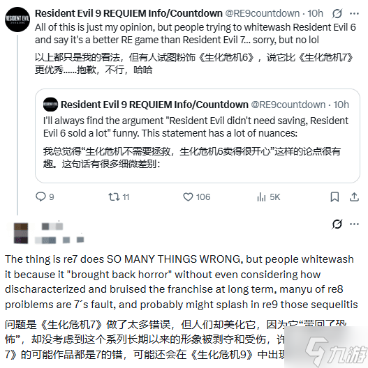 而@AestheticGamer1立刻发言反驳表示:比起《生化危机6》我更喜欢《生化危机7》,但我也比大多数人更喜欢《生化危机6》。