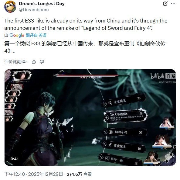 将《仙剑奇剑传四:重制版》戏称为“类《33号远征队》游戏”而引发关注的海外游戏博主@Dreamboum,其最新动态再次引起玩家社群讨论。出乎外界预料,博主并未继续讨论这一争议性话题,反而将目光投向《仙剑奇侠传七》并开启游戏直播。