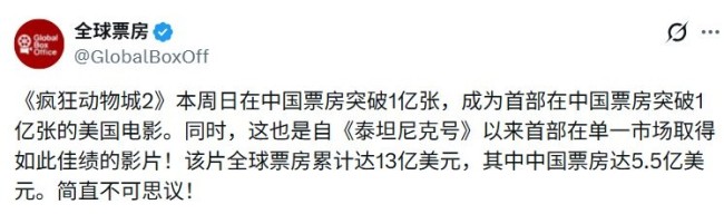 而《疯狂动物城2》的全球总票房现已超过14亿美元。