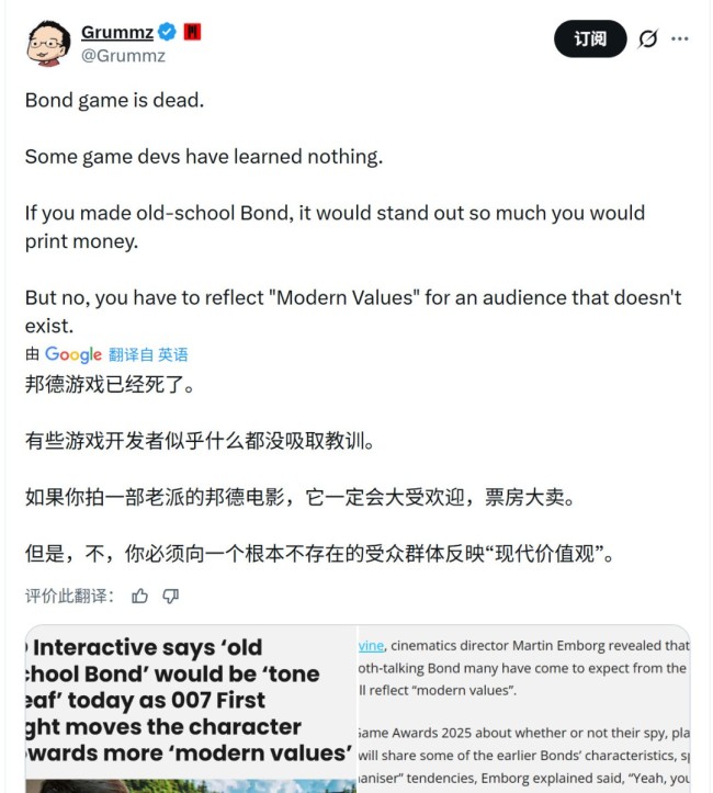 但他同时强调,邦德这个角色本身一直在变化。“这个角色随着年代不断进化,而我们显然要反映当下的价值观。所以它不会是那种老派的邦德形象,那样在今天只会显得很冒犯、很不合时宜。他是一个现代的家伙。”