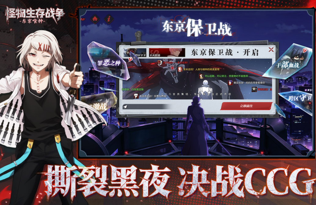 基于《东京喰种》世界观打造,融合卡牌构筑与轻度自走棋机制。地图以卡通化东京为舞台,玩家通过抽卡获取不同赫子类型喰种,依据Rc细胞值、赫子形态与克制关系制定布阵策略。主线任务深度还原原著关键战役,暗黑美学贯穿UI与特效设计,CCG玩法强调卡组协同与临场应变。