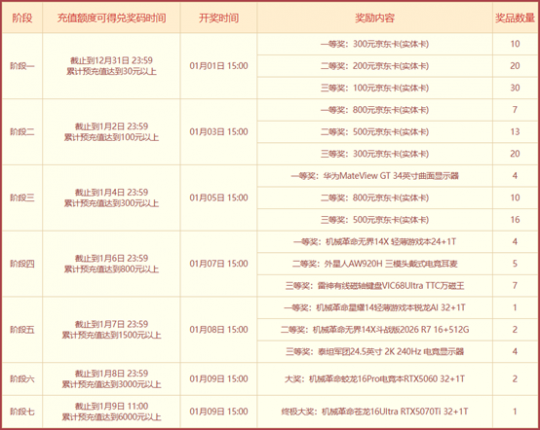2025年12月29日开启预充值后-2026年01月09日11:00期间,在“2026”服务器进行预充值,累计充值额达到相应的额度即可获得一个抽奖资格码来参与抽奖活动。累积预充值额度越高可参与抽奖的次数越多,奖池内的奖励也就越丰厚!