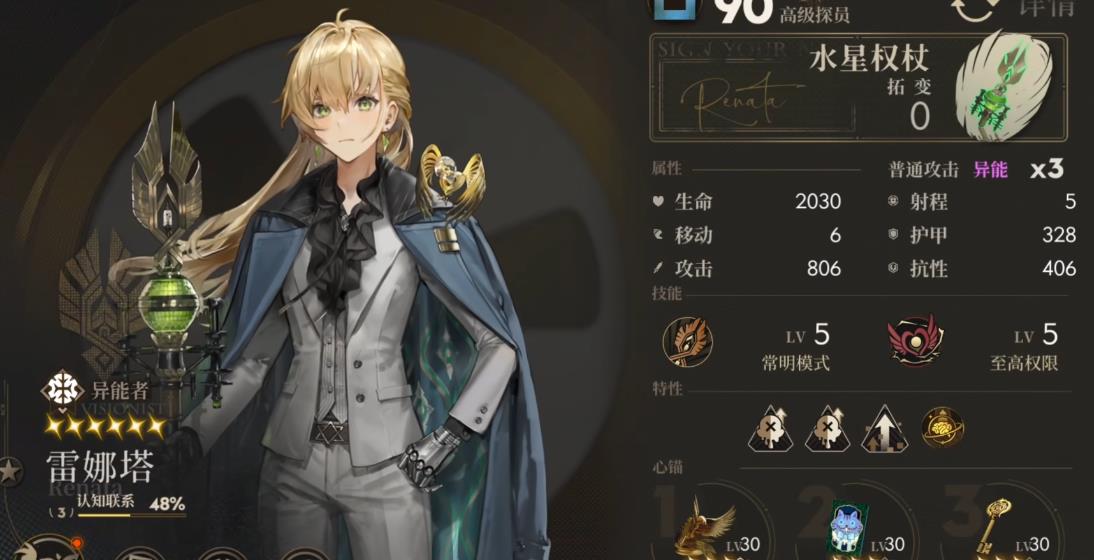 雷娜塔是法则系的异能职业三段攻击角色,二技能至高权限具备有较强的单点爆发能力。算得上是游戏里爆发输出最高的一档角色,也是玩家必备的带电角色。另外两个是电光游侠与乌拉尼娅,三个电系角色里至少要练一个。她在群怪环境里强度适中,开启一技能后可警戒攻击三次,且三次都能立刻享受到附加带电的双暴增益。伤害极高,能稳定击倒危险程度低的敌人,对中或高危险程度敌人,还能附加两回合带电来提升队友伤害。