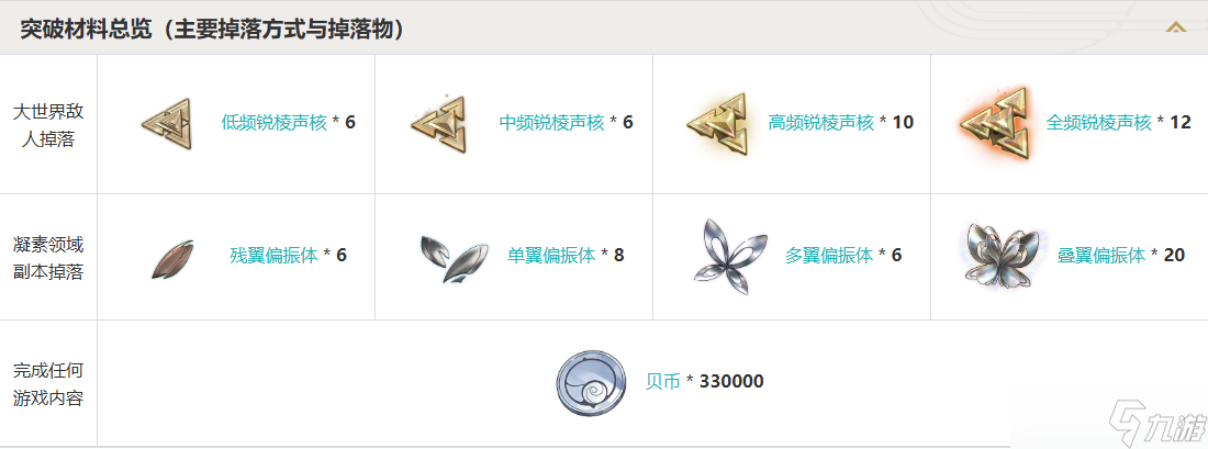 贝币×330000、低频锐棱声核×6、中频锐棱声核×6、高频锐棱声核×10、全频锐棱声核×12、残翼偏振体×6、单翼偏振体×8、多翼偏振体×6、叠翼偏振体×20