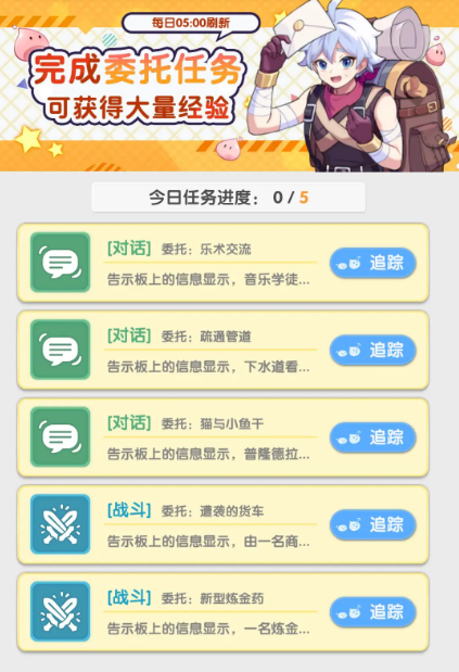 1、委托板每日5点刷新,固定为5个任务,其中3个是对话任务,2个是战斗任务,会随机触发一个隐藏任务。