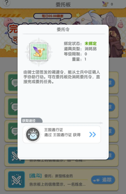 2、委托任务,可以手动接取来完成,如果没有时间做任务或者小懒,可以使用委托令(通过王国通行证获得)直接完成任务。