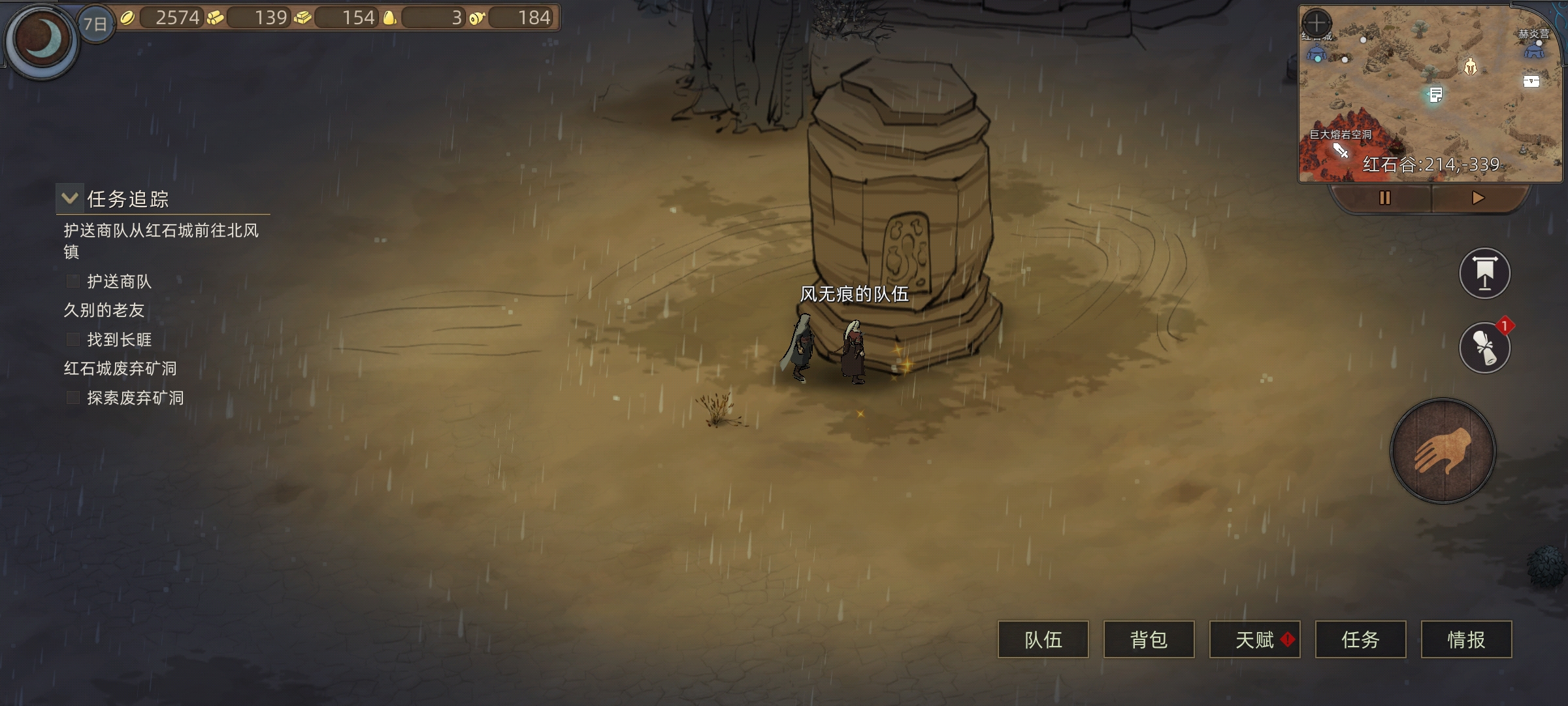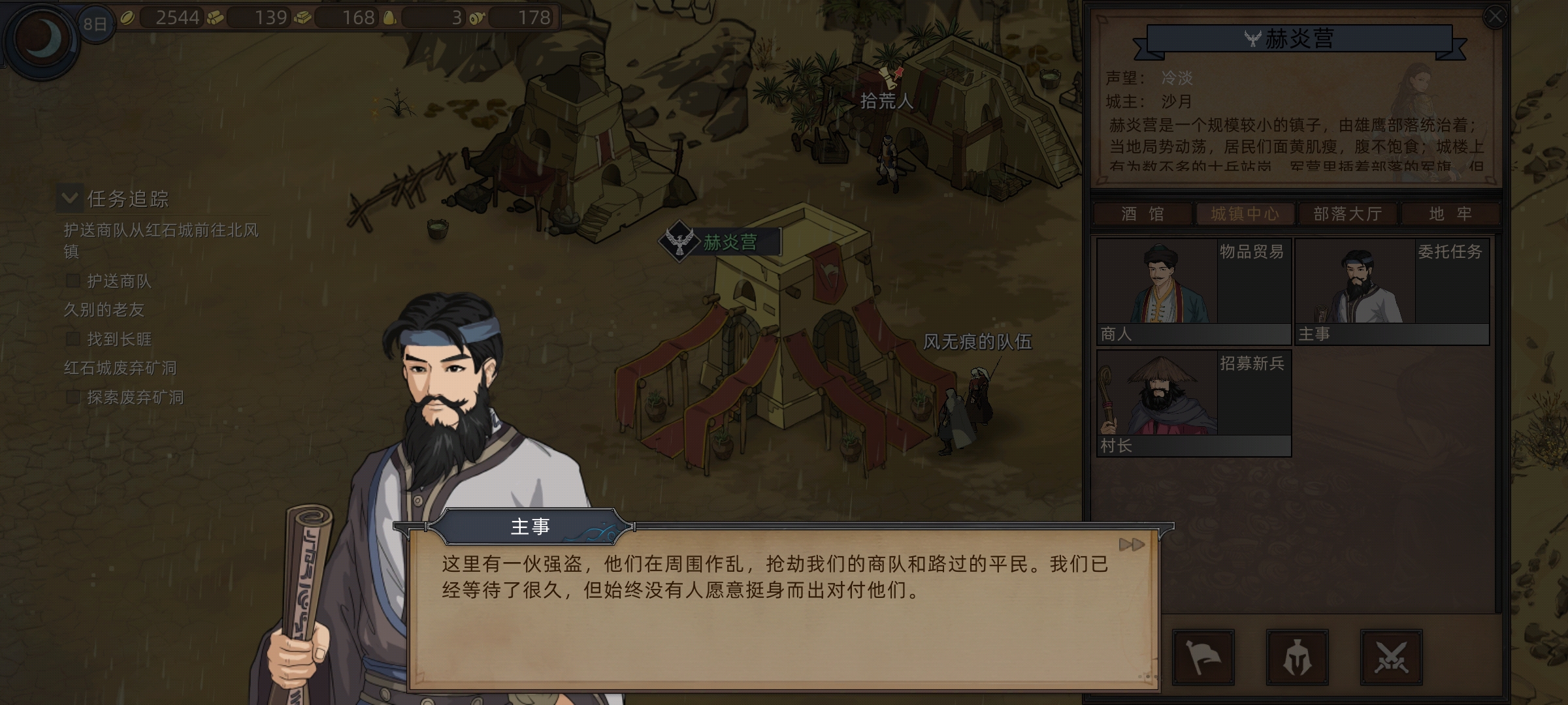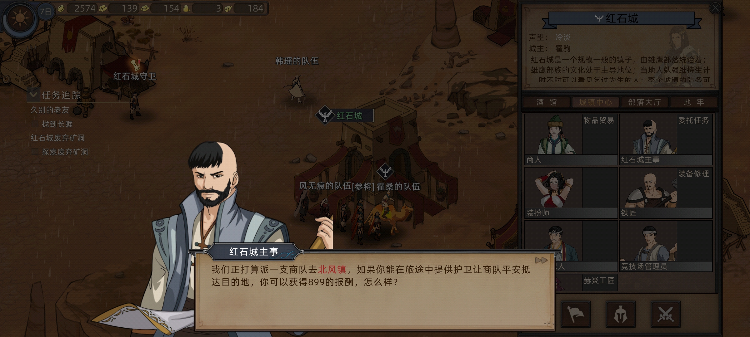 做完驿马村任务后我们接着往上走回到红石城,运气非常好随机到商队任务。这个任务最舒服,直接领取就好,不用护送商队,让它自力更生。大概率它自己能安全到达的,嘻嘻~白得奖励。