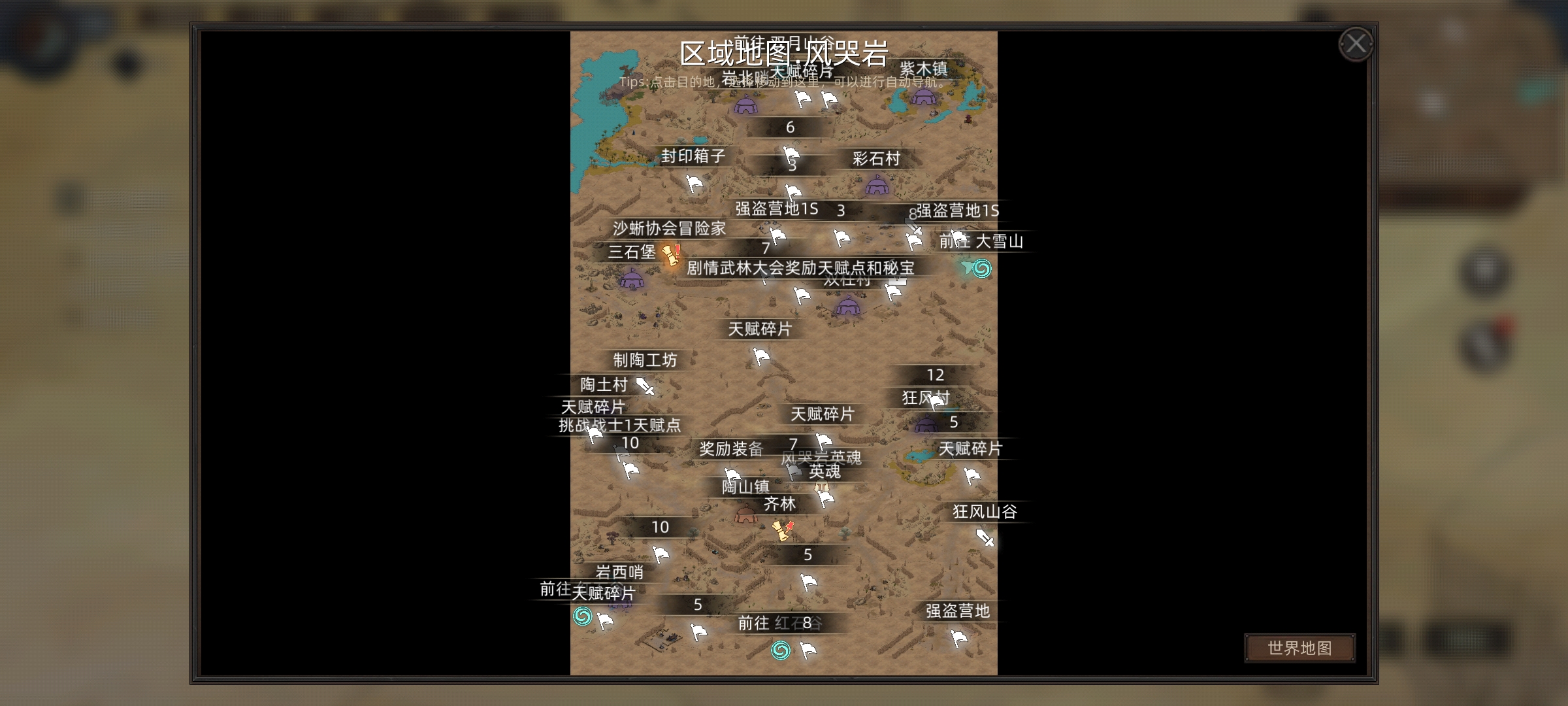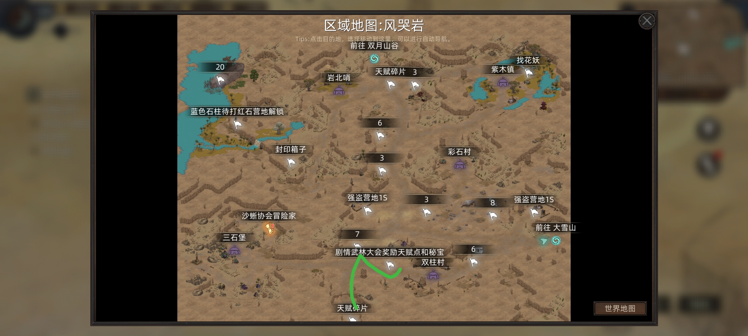 好了,风哭岩已经探索完毕,下面风无痕准备踏上右边大雪山地图旅途了