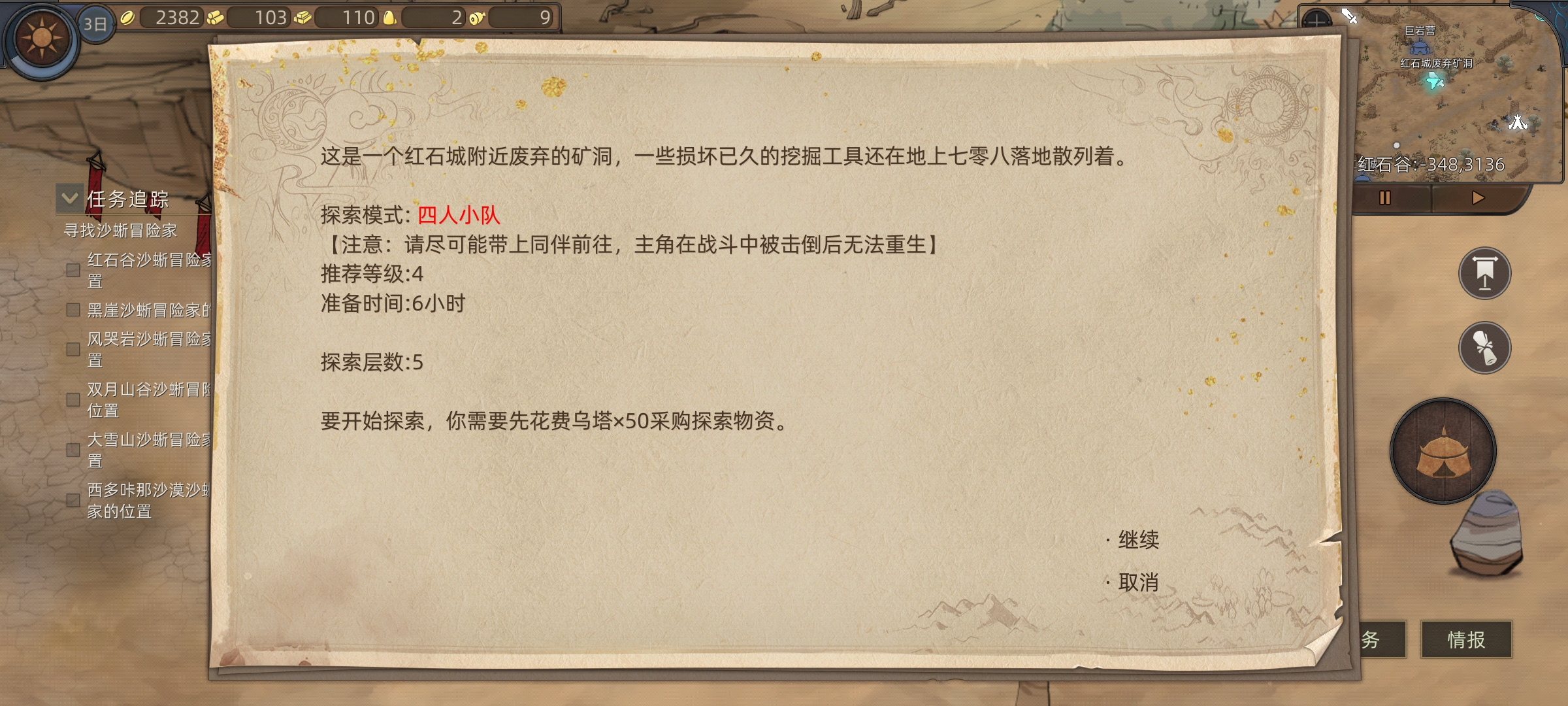然后往右边走开启我们第一个5级小队副本,这里难度比较大,新人可能打不了可以先不打。因为我是五周目初始等级11级开局才打的过的,你们1级开局先别打这个。然后我们打过的副本最好养成在地图做标记的好习惯,这样后面你打开地图就可以轻松找到自己想刷的副本。像这种普通副本就做个难度等级的标记就行了。