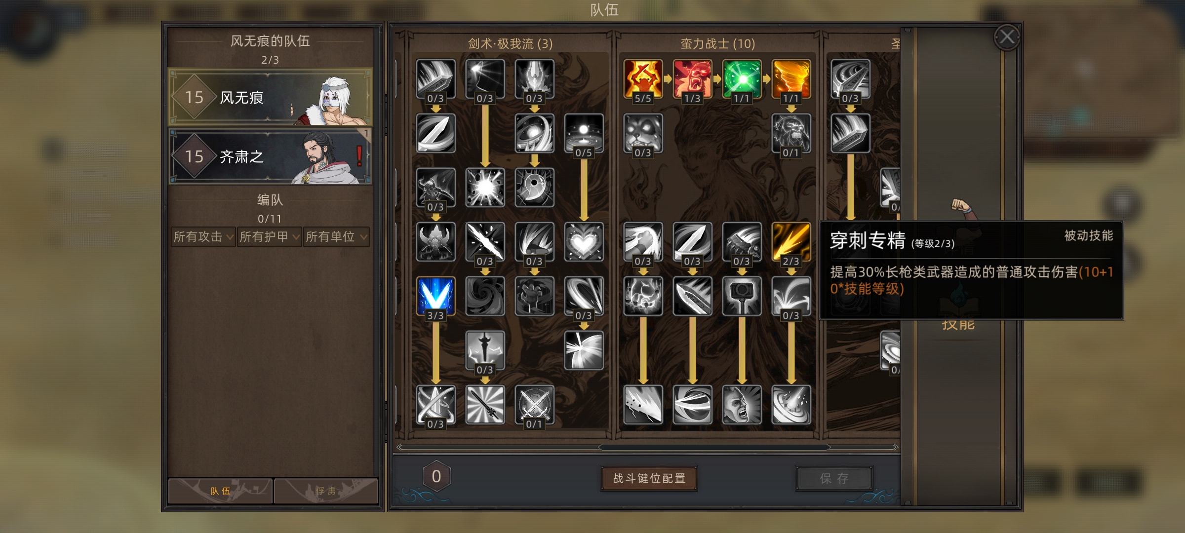 这边因为楼主是五周目难度,所以初始等级11级,游戏等级上限45级。技能点加上开局的一点结晶总共12点可以分配,这里花两点给野兽技能页,点出10%被动吸血。让我们的主角风无痕具备战斗续航能力
