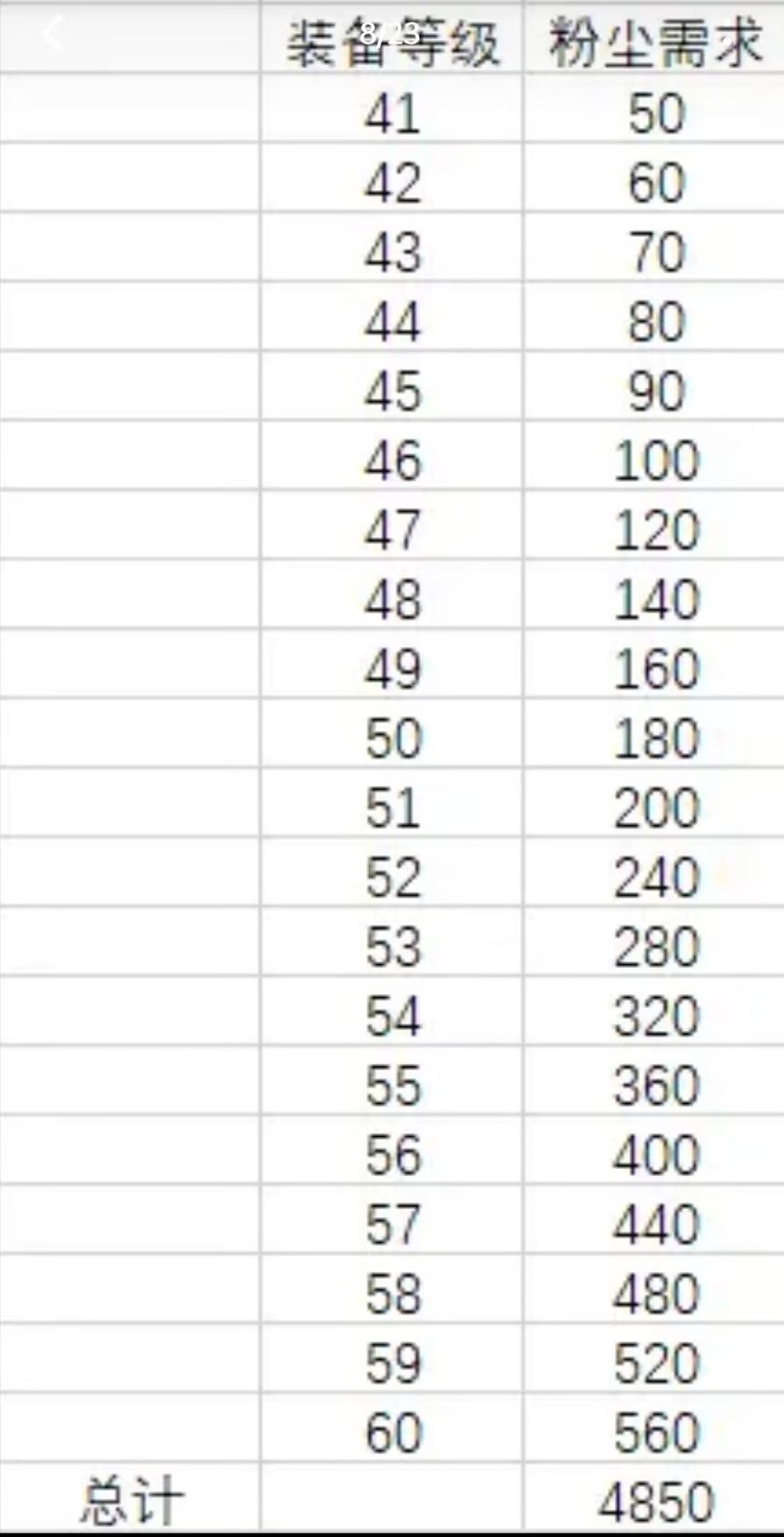8、混沌装备升级,途径:铁匠铺-混沌升级-强化(图15),强化所需粉尘数量如下(图16,借用群友的图),慢慢攒粉尘升级就好了。